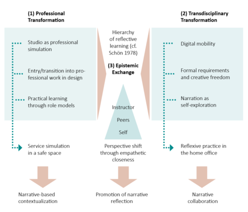 - Zielgruppen im Wandel: Anschlussfähigkeit für berufsbegleitend Studierende und Quereinsteiger:innen; Zugehörigkeit zur Designdomäne als pädagogisches Ziel.